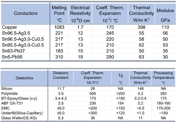 Table 1 shows the key characteristics of materials used to build this package. Typical values for each type of material are listed. However, physical properties do vary with a material composition that is customarily fine-tuned to meet specific processing and package performance requirements.