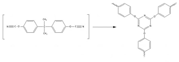 This type of resin demonstrates superior electrical properties to epoxies. Cured resin’s dielectric constant and loss factor are lower than that of FR-4. Various cyanate ester-based formulations have been developed and found applications specifically for microelectronics packaging applications, which include: underfill, coating, adhesive, encapsulant, chip carrier substrate, buildup dielectric film, printed circuit boards (PCB), photoresist, etc. They have been included in formulations for a wide range of applications in the advanced composites industry as well.